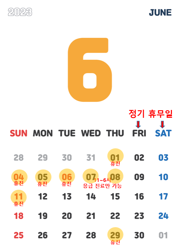 6월 7일과 8일은 11시~6시에 한해 응급 진료만 가능합니다 (정상적인 월치료는 불가능합니다)