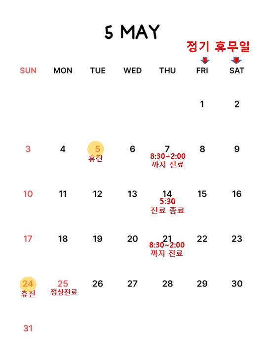 5월 25일 대체휴일은 11시~7시까지 정상진료입니다.