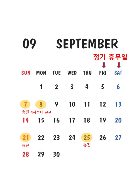 9/7 (일) , 9/21일 (일) , 9/25일 (목) 휴진입니다.